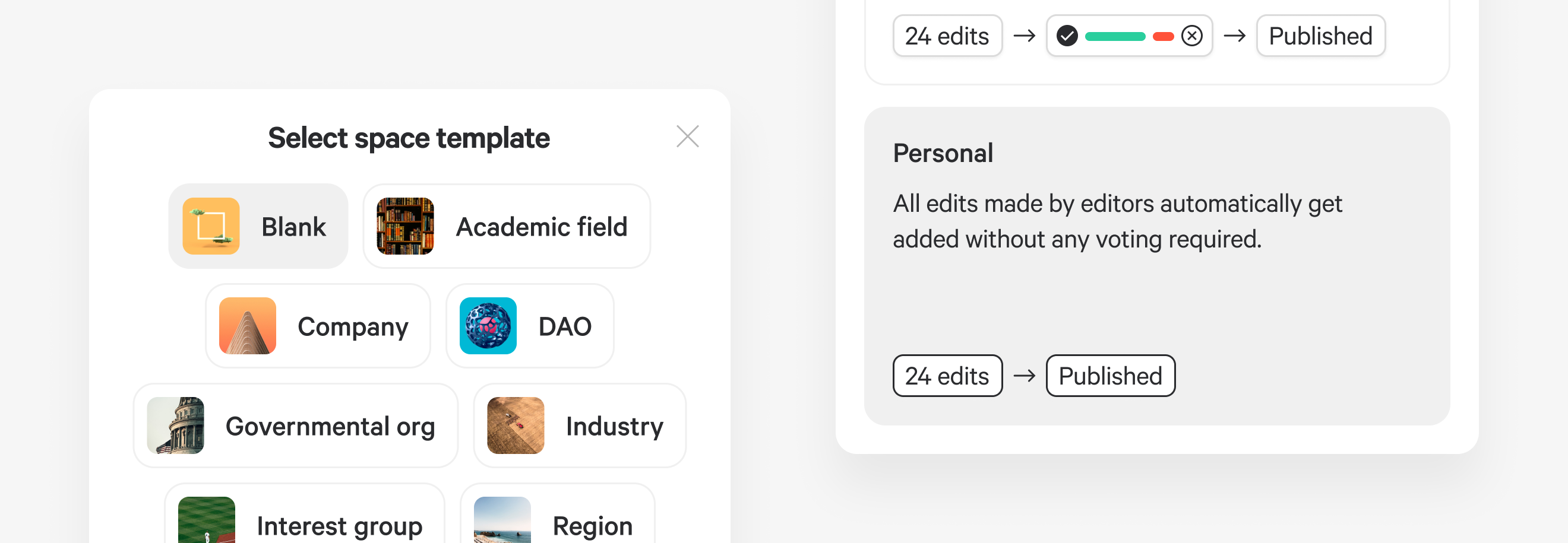 As an editor you’ll see a feed containing actionable cards related to different proposal types; new editor requests and removals, member requests and removals and edits posed by editors and members of the space. These cards contain the most pertinent information about that particular proposal, but if you’d like to see more information you can interact with the card anywhere outside of the accept or reject buttons to open it up in a full screen view.