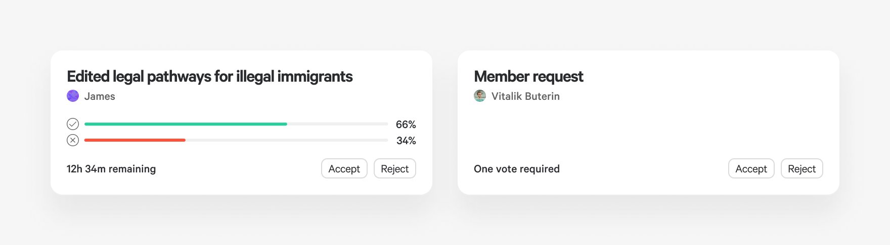 1. For proposals that require a 24 hour vote: you’ll see a card title, time left in hours and minutes, the creator of the proposal, an accept and reject button and a visual representation of how editors have voted in realtime.